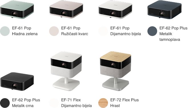 Epson EF-72 Flex Plus uključuje ambijentalno osvjetljenje, priključak tipa C i poboljšanu funkcionalnost zvučnika za korisnike usmjerene na zabavu. Svi modeli sadrže isti alat za obradu slike, Sound by Bose i ugrađeni Google TV.